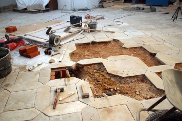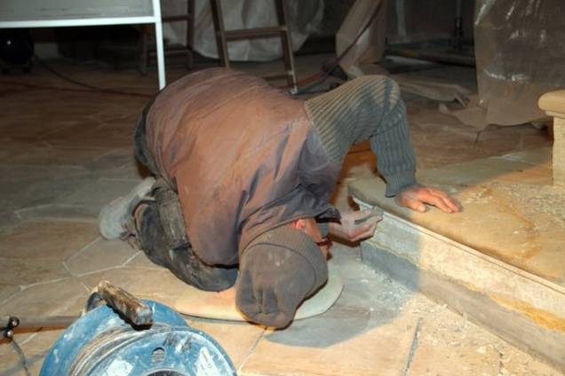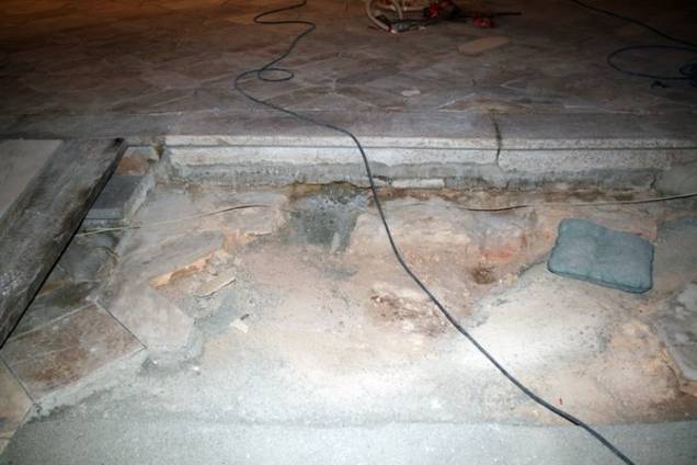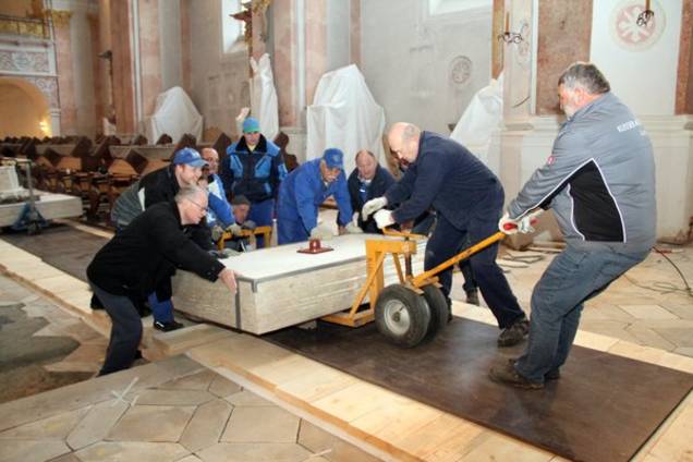 Die Instandsetzung des Bodens und der Stufenanlagen an den Altären erfolgt in vielen aufeinander abgestimmten Arbeitsschritten. Wie Sicherung des Untergrundes durch Haftfüllung, Ausbauen und Kleben von einzelnen gebrochenen Platten, Entfernen von schadhaften Fugen, Ergänzen von Schadstellen mittels speziellen, auf den Belag abgestimmten mineralischen Mörteln, Erneuerung der Fugen, Reinigen der Platten, vorsichtiges Schleifen der Oberflächen usw. Zudem mussten im Boden Leerrohre für Elektrokabel verlegt werden.