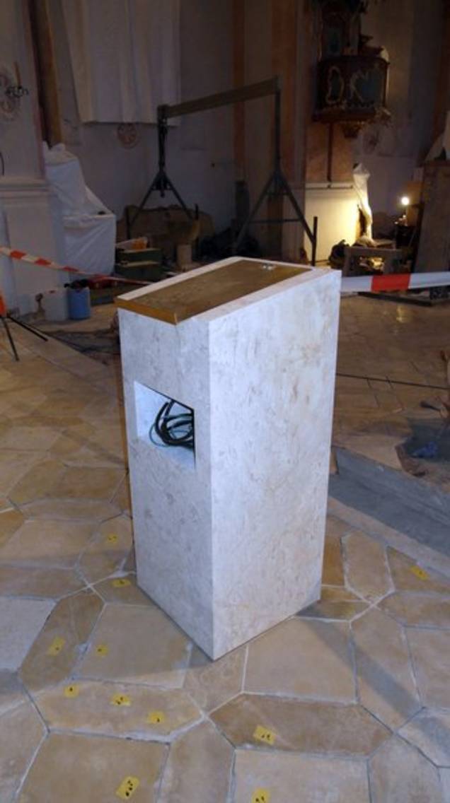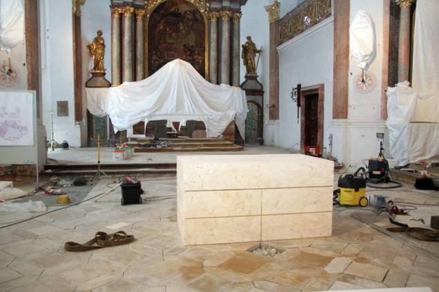 Der neue Volksaltar ruht nun direkt auf dem historischen Belag und ist in seiner Grundfläche auf das Verlegemuster abgestimmt. Er besteht aus drei Teilen mit einem Gewicht von je 1,9 Tonnen, wiegt also insgesamt 5,7 Tonnen und ist gesamt 186 Zentimeter lang, 106 Zentimeter breit und 96,5 Zentimeter hoch. Die drei Teile wurden mit Hubwägen in die Kirche befördert und über einer Krananlage in stundenlanger Arbeit millimetergenau aufeinandergesetzt. Der jetzt vom Volk aus gesehen sich links vom Altar befindliche Ambo wiegt rund 800 Kilogramm und hat die Maße 50 mal 50 mal 120 Zentimeter.