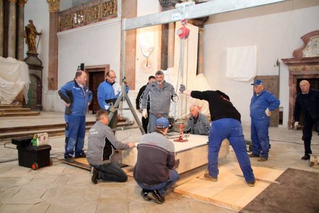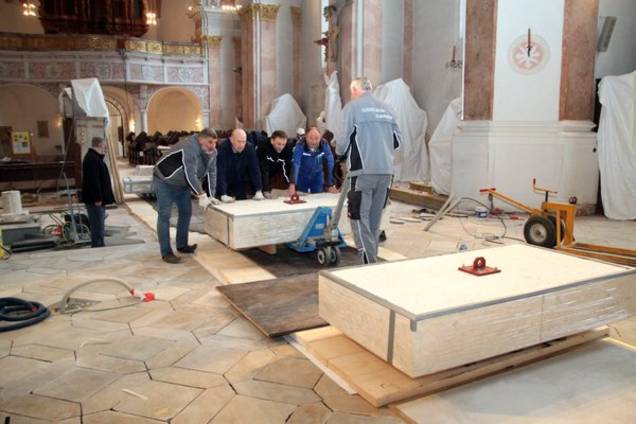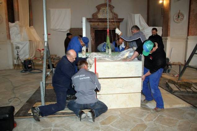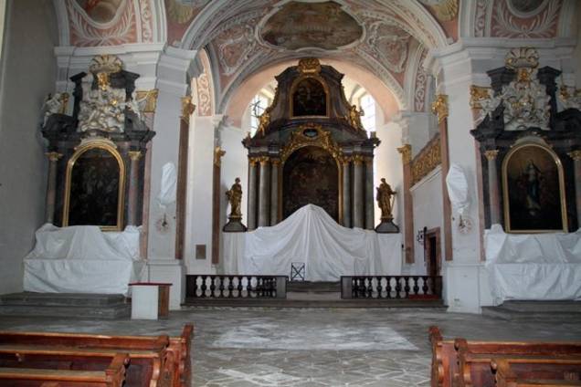 Die Natursteinarbeiten, also die Restaurierung der Bodenbeläge, besorgt die Firma Monolith GmbH aus Bamberg. Damit Feinstaub nicht an die Figuren und Kreuzwegstationen kommt, wurden diese abgehängt, die Altäre von Diplom-Restaurator Ulrich Weilhammmer aus Gangkofen „eingehaust“.