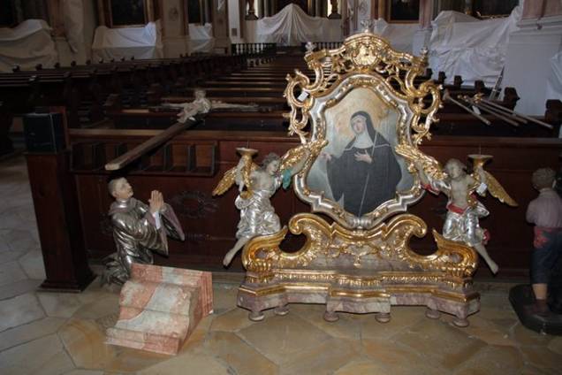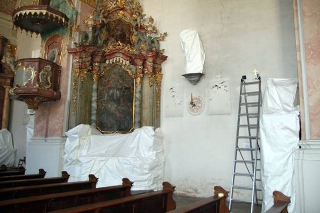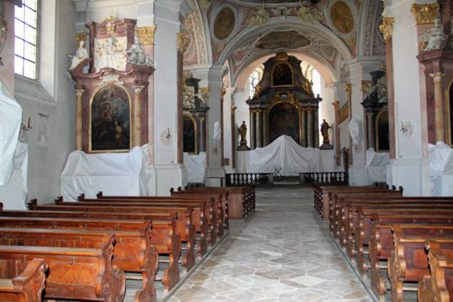 „Nachdem seitens einzelner Förderstellen die Förderzusagen etwas verspätet eingegangen sind und damit die Angebotseinholungen erst im zweiten Quartal dieses Jahres erfolgen konnten, konnte erst ab Mitte Juni mit der Baumaßnahme begonnen werden“, berichtet die Architektin der MZ. Erster Schritt war die Räumung des Kirchenraums, der Sakristei und der Nebenräume im ehemaligen Kreuzgang durch viele fleißige ehrenamtliche Helfer der Pfarrei, ebenso der Abbau der mobilen Ausstattung wie Figuren, Kreuzwegstationen, Kerzenleuchter und sonstiger liturgischer Gegenstände. Sie sind nun in einem gesonderten Raum des Klosters untergebracht. Altäre und Gemälde wurden so weit wie möglich durch den zuständigen Diplom-Restaurator Ulrich Weilhammer aus Gangkofen verhängt „Fachausdruck: eingehaust), um sie vor Staub zu schützen. Anfang Juli mussten die Orgelpfeifen vom Orgelbauer abgebaut bzw. gesichert werden. Dann erst konnte der schadhafte Sockelputz von Helfern der Pfarrei unter Aufsicht der Restauratorin vorsichtig abgeschlagen werden.