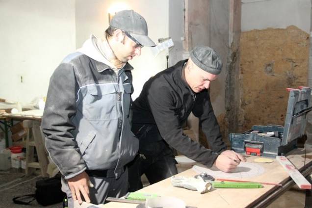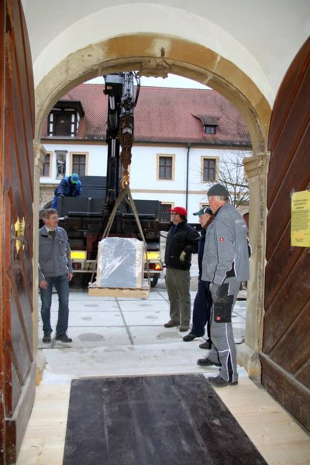 „Nach Baustelleneinrichtung Mitte Juli war der Weg frei für die restauratorische Überarbeitung des historischen Natursteinplattenbelags aus Kalkstein aus dem Kelheimer Raum, der im Rosenspitzmuster verlegt ist. Diese Arbeiten erfordern hohe handwerkliche Kunst und restauratorische Sensibilität von den Fachleuten der Firma Monolith aus Bamberg, die auf Steinrestaurierung und -sanierung spezialisiert ist. Da es sich hier um einen Boden handelt, der schon zur Bauzeit um 1715 verlegt wurde und bis in die heutige Zeit erhalten geblieben ist, waren natürlich auch die ‚Gebrauchsspuren’ und Schäden wie gebrochene Platten, abgeschieferte Oberflächen, starke Verschmutzungen, offene Fugen und dergleichen zu verzeichnen. Das Vorhandensein eines bauzeitlichen Natursteinbodens ist keine Selbstverständlichkeit, da gerade in der Nachkriegszeit diese Böden oft entfernt und durch neue Plattenbeläge ersetzt wurden“, erklärt die Architektin gegenüber der MZ.