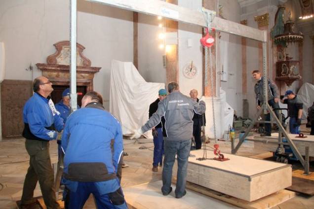„Eigentlich war schon nach dem Weißen Sonntag geplant, mit den Ausräumarbeiten zu beginnen“, erklärt Pfarrer Pater Hermann Sturm der MZ, „Nun aber sind die Ausräumarbeiten abgeschlossen und es kann mit der Bodensanierung begonnen werden. Fast gespenstisch wirkt nun der Kircheninnenraum mit den entfernten Heiligenfiguren und den zum Schutz vor Feinstaub „eingehausten“ Altären. Auch die Orgel muss noch „eingehaust“ und damit vor Feinstaub geschützt werden. Hier müssen sogar Orgelpfeifen entfernst werden.
