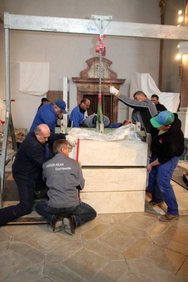 Während die Arbeiten an den Bodenplatten noch nicht abgeschlossen sind, wurde bereits in der Adventszeit die Neugestaltung des Altarraums in Angriff genommen. 2013 waren vier Künstler zur Abgabe eines Entwurfes zur künstlerischen Neugestaltung des liturgischen Ortes (Zelebrationsaltar, Ambo, Kredenz und Sedilien) aufgefordert. Die Beiträge wurden anonym und vom bischöflichen Baureferat vorgeprüft. Im Juli diesen Jahres fand die Jurysitzung statt. Sie setzte sich aus Vertretern des Bischöflichen Ordinariats (Kommission für kirchliche Kunst), der Kirchengemeinde (Pfarrer Pater Hermann Sturm, Kirchenpfleger Johann Fink und dem Sprecher des Pfarrgemeinderates), des Gebietsreferenten des Bayerischen Landesamtes für Denkmalpflege, Bürgermeister Markus Dollacker und Architektin Carola Setz zusammen. Der Entwurf von Josef Saildorfer konnte die Jury überzeugen. Für Mensa (Volksaltar), Ambo und Sockel des historischen Taufsteins war vom Künstler ein heller Kelheimer Kalkstein vorgeschlagen worden. Der für die Herstellung benötigte Steinblock wurde am 1. August von Vertretern der Kirchenverwaltung direkt im Steinbruch ausgewählt.