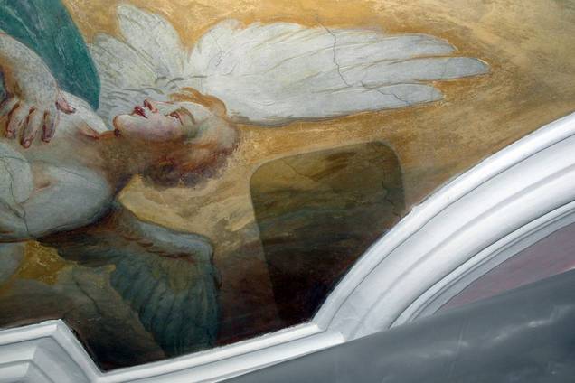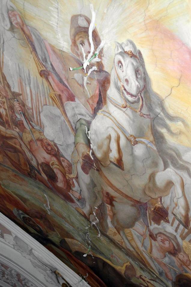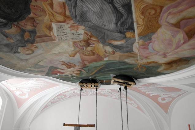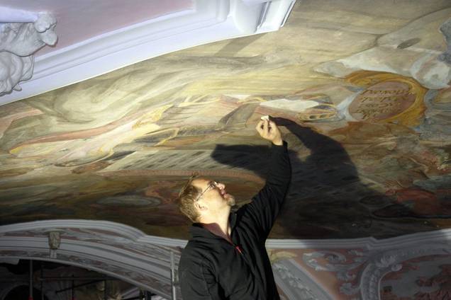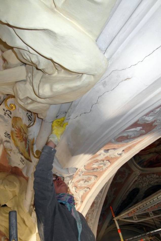 Arbeiten an den Deckenfresken des Langhauses und der Hochaltarebene. Dabei mussten zuerst instabile Farbschichten gefestigt werden. Erst dann konnten Hohlstellen (Foto 7 und 8) hinterfüllt, die Bilder gereinigt (Foto 9) und abschließend retuschiert werden.