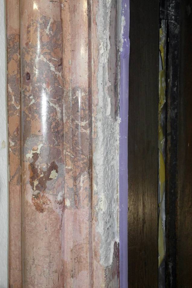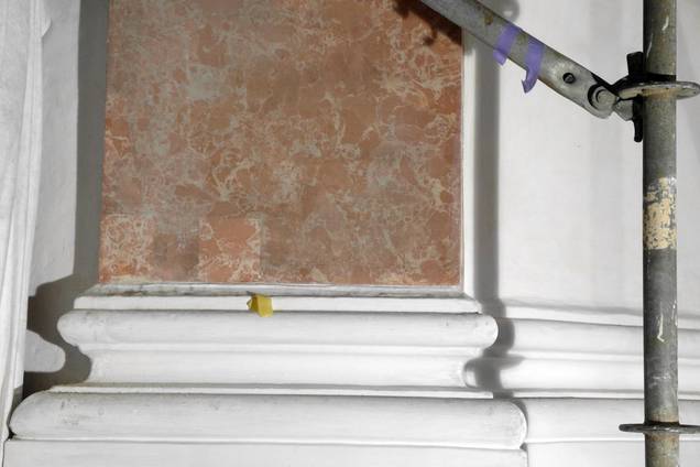 Restaurierung des Stuckmarmors an den fünf vorderen Altären (Hochaltar und die vier östlichen Altäre), an den Pilastern (Foto 10) und an den marmorierten Turmfassungen. Die Oberflächen des Stuckmarmors mussten primär gereinigt (Foto 11) und dann an einigen Stellen konservatorisch geschlossen werden. Bei größeren Fehlstellen wie bei den Turmfassungen mussten diese handwerklich ergänzt werden. (Foto 12 und 13)