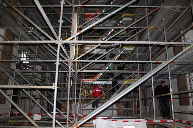 Fertigstellung der Raumschale des Kirchenschiffs in den vom Gerüst aus zugänglichen Bereichen (weißer Stuck, weiße Wände und farbig gefasste Rücklagen). Foto 1.