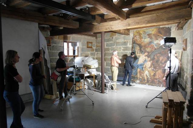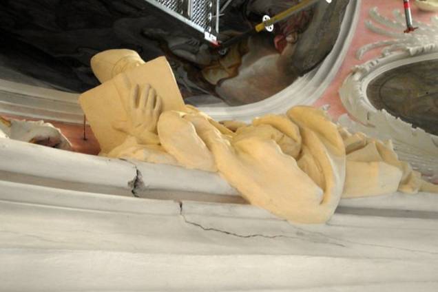 „Das Jahr 2016 stand ganz unter dem Motto Fortschreiten der Restaurierungen von Raumschale und Ausstattung“, berichtet nun Architektin Carola Setz. Auch hier erfolgte die Sanierung in mehreren Schritten. Zuerst wurden die Flächen trocken und zum Teil auch feucht vorsichtig gereinigt. Dann mussten Schäden wie Risse und Hohlstellen beseitigt werden. Abschließend erfolgte die Kalk-Fassung der Oberflächen durch den Auftrag von Grundierung und mehreren Kalkanstrichen. Aufgrund des milden Winters konnten die Arbeiten sowohl im Kirchenschiff als auch in der Sakristei und im Vorraum bereits im Frühjahr beginnen. Dann wurden nach intensiven Bemusterungen die roten Rücklagen der Deckenflächen neu gefasst werden. Es folgten die Konservierung und Restaurierung der Altäre: Reinigung, Beseitigung von Schäden und Konservierung, Retusche und abschließende Oberflächenbehandlung. „Insgesamt ein sehr konservatorisches Vorgehen, damit auch das gewohnte Erscheinungsbild als Ganzes erhalten bleibt“, erläutert die Architektin. Im 2. Quartal 2015 konnte mit der Restaurierung der Deckenfresken von Cosmas Damian Asam im Langhaus und im Bereich der Hochaltarebene begonnen werden. Bis Ende Februar 2017 sollen alle Fresken, einschließlich des großen Kuppelfreskos saniert sein.