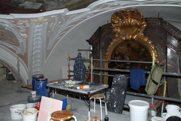 Die Restaurierung von Gemälden erfolgte zum Teil in den Werkstätten und Ateliers der Restauratoren (Schutzengelbild). Gemälde der Seitenaltäre aus Stuckmarmor (Foto 5), zum Teil aber vor Ort. (Foto 6)