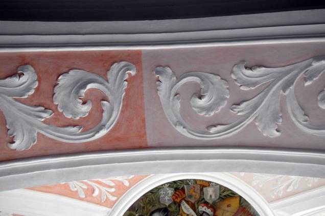 „Auch hier erfolgt die Sanierung in mehreren Schritten. Zuerst werden die Flächen trocken und zum Teil auch feucht vorsichtig gereinigt. Dann müssen Schäden wie Risse und Hohlstellen beseitigt werden. Abschließend erfolgt die Kalk-Fassung der Oberflächen durch den Auftrag von Grundierung und mehreren Kalkanstrichen“, informierte die Architektin die Gemeinderäte. „Aufgrund des milden Winters konnten die Arbeiten sowohl im Kirchenschiff als auch in der Sakristei und im Vorraum durchgeführt werden. Momentan werden nach intensiven Bemusterungen die roten Rücklagen der Deckenflächen neu gefasst.“